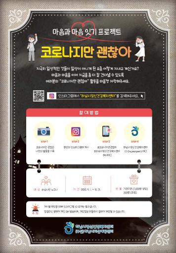 ‘코로나지만 괜찮아’는 서로의 마음과 마음을 이어 일상을 건강하게 유지할 수 있는 다양한 방법에 대해 서로 공유하고 소통하는 프로젝트이다.