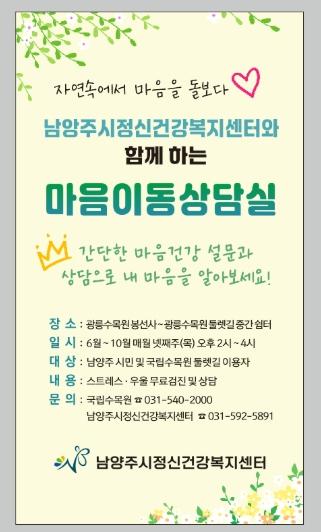 [한국뉴스타임=편집국] 남양주시는 6월부터 10월까지 광릉숲길 쉼터에서 시민 대상‘마음이동 상담실 광릉수목원 캠페인’을 운영한다.