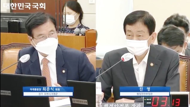 [한국뉴스타임=국회] 21일 국회 제381회 제1차 행정안전위원회 전체회의가 개최되었다. 이날 행정안전부 진영 장관에게 질의에 나선 포천시가평군 최춘식 국회의원은 "집중호우로 인해 극심한 어려움을 호소하고 있는 수해 피해자분들을 위해 가용한 재원을 신속히 교부하고 집행하도록 건의하고, 가평군 지역을 포함한 심각한 수해 피해를 입은 지역을 신속히 특별재난지역으로 선포하기를 요청합니다."라고 주문했다. 또한 의암댐 선박 전복사고에 대한 신속한 수사와 작업 지시를 내린 책임자에 대한 문책을 요구했다.