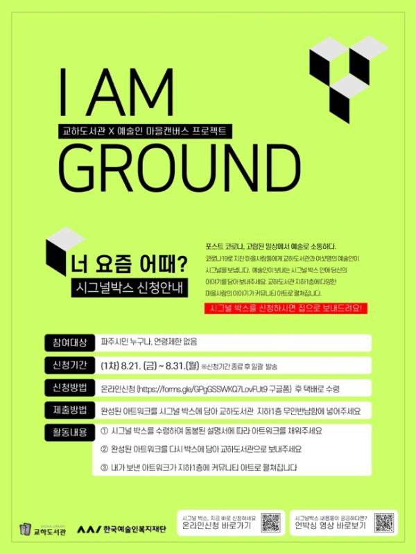 교하도서관은 온라인으로 프로젝트 참여자를 모집하며 신청자의 집으로 예술인들이 기획한 아트워크가 담긴 ‘시그널박스’를 배송한다. 시그널박스에는 아트워크의 재료와 설명서가 담겨있으며 마을사람들은 시그널박스를 통해 코로나 상황에 대한 각자의 생각과 일상을 예술적 방식으로 풀어낼 수 있다. 오는 10월에는 예술인팀이 마을사람의 이야기가 담긴 시그널박스를 모아 교하도서관 지하 1층에 커뮤니티 아트를 설치할 예정이다.