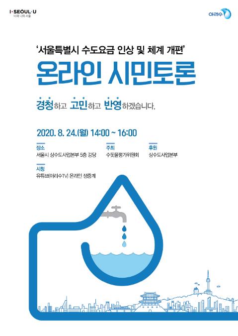 이번 토론회는 지난 6일 입법 예고된 서울시 수도요금 인상과 요금체계 개편안에 관해 논의하는 자리로, 코로나19 확산 방지를 위한 사회적 거리 두기 차원에서 온라인 토론회로 진행된다. 유튜브(YouTube) ‘아리수TV’ 채널에서 14:00시부터 실시간 생중계되며 누구나 시청할 수 있다.