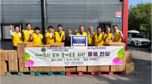 이번 기부는 ㈜아티의 물품 후원과 구리라이온스클럽의 전달 협력을 통해 이뤄졌으며, 후원 물품은 학습에 필요한 문구류부터, 아동의 흥미를 고려한 완구류까지 다양하게 구성됐다.
