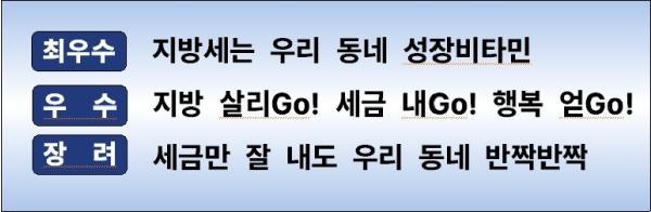 최우수상은 ‘지방세는 우리 동네 성장비타민’이 차지했다. 우수상에는 ‘지방 살리Go! 세금 내Go! 행복 얻Go!’, 장려상에는 ‘세금만 잘 내도 우리 동네 반짝반짝’이 선정됐다.