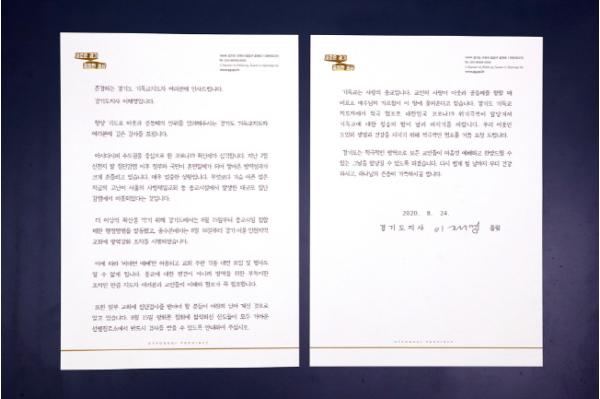 이재명 지사는 편지에서 “신천지 발 집단감염 이후 정부와 국민이 혼연일체가 되어 쌓아온 방역성과가 크게 흔들리고 있는 매우 엄중한 상황”며 “더 이상의 확산을 막기 위해 경기도에서는 8월 15일부터 종교시설 집합제한 행정명령을 발동했고, 중수본에서는 8월 19일부터 경기·서울·인천지역 교회에 방역강화 조치를 시행했다”고 현 상황을 설명했다.