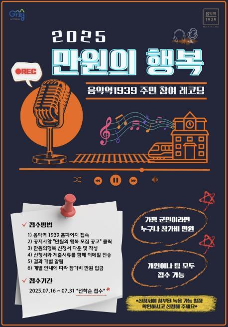 [한국뉴스타임=편집국] 가평군이 음악도시 이미지에 걸맞게 ‘2025년 음악역1939 만원의 행복’ 레코딩 프로젝트를 진행한다.
