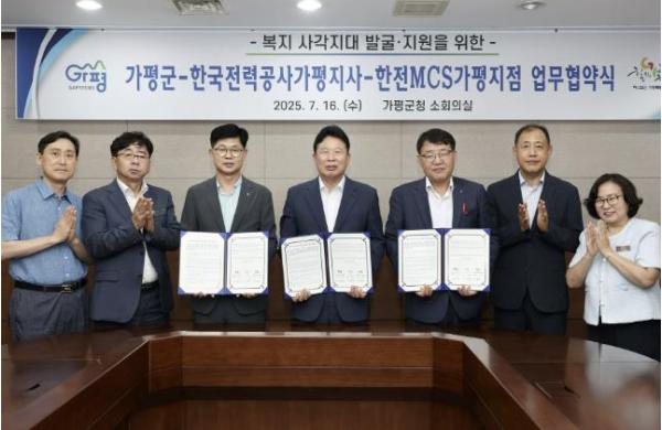 군은 16일 본청 회의실에서 한국전력공사 가평지사, 한전MCS㈜ 가평지점과 함께 ‘위기가구 발굴 및 지원을 위한 업무협약(MOU)’을 체결했다. 이번 협약은 공공과 민간이 긴밀히 협력해 지역 내 위기가구에 대한 효율적인 복지 전달체계를 실현하기 위해 마련됐다.