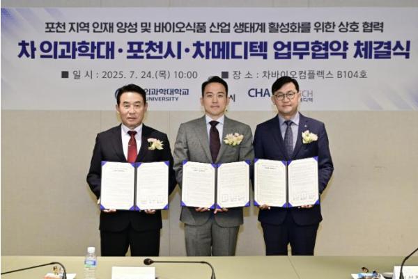 [한국뉴스타임=편집국] 포천시는 지난 24일 차바이오컴플렉스에서 차의과학대학교, 차메디텍과 포천 지역인재 양성 및 바이오식품 산업 생태계 활성화를 위한 3자 간 업무협약을 체결했다.