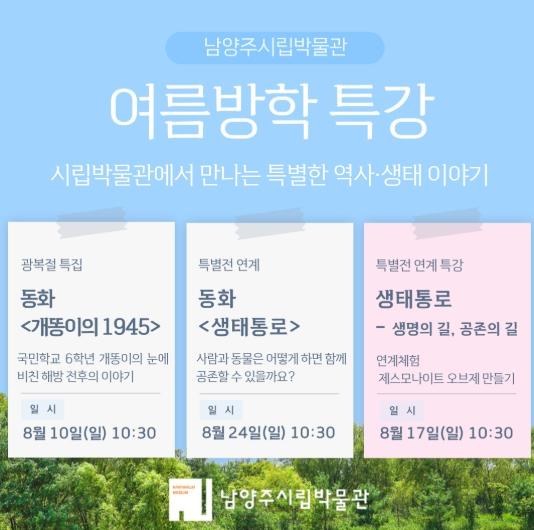 [한국뉴스타임=편집국] 남양주시는 여름방학을 맞아 8월 중 남양주시립박물관에서 가족과 어린이를 위한 여름방학 교육 프로그램 ‘동화 속 역사이야기’와 ‘생태통로–생명의 길, 공존의 길’을 운영할 예정이라고 밝혔다.