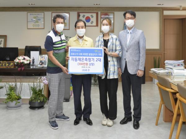 [KNT한국뉴스타임=포천] 포천시 가산면 소재 ㈜라은(대표 오미라)은 24일 코로나 예방을 위한 비대면 자동체온측정기 2대(300만원 상당)를 포천시에 기탁했다.