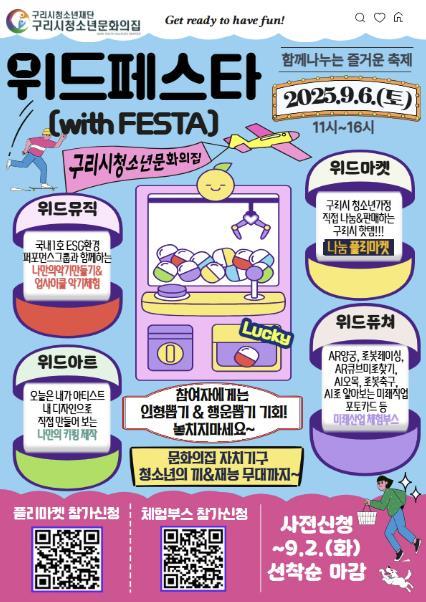 [한국뉴스타임=편집국] 구리시에서는 오는 9월 6일 11시부터 16시까지 구리시청소년문화의집 일대에서 ‘함께 나누는 즐거움-제2회 2025 위드페스타(With Festa)’를 개최한다.