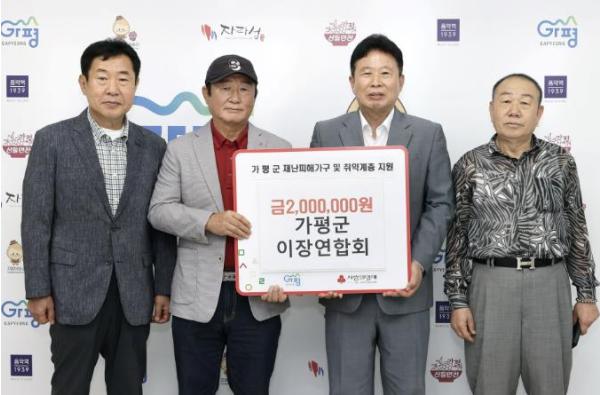 채만경 회장은 “호우 피해로 힘든 시간을 보내는 군민들에게 작은 보탬이 되길 바란다”며 “앞으로도 주민들의 아픔을 덜어드리기 위해 가평군 이장 일동은 최선을 다하겠다”고 말했다.