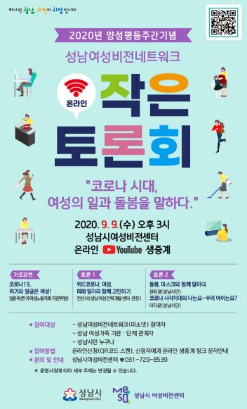 [KNT한국뉴스타임] 성남시는 오는 9월 9일 오후 3시~5시 ‘코로나 시대, 여성의 일과 돌봄을 말하다’를 주제로 한 온라인 토론회를 개최한다.