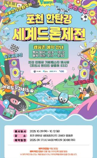 [한국뉴스타임=편집국] 포천시 한탄강에서 10월 9일부터 12일까지 열리는 ‘포천 한탄강 세계드론제전’ 기간 동안, 캠핑과 드론, 공연을 동시에 즐길 수 있는 ‘코베아 캠핑페스타’가 개최된다.