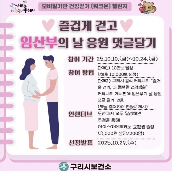 구체적인 방법은 ▲워크온 앱 설치 ▲구리시 공식 커뮤니티 ‘즐거운 걷기, 더 행복한 건강생활’ 가입 ▲챌린지 동안 10만 보 달성 ▲공식 커뮤니티 게시판에 임산부의 날 응원 댓글과 인증사진 게시 순으로 진행된다. 미션을 달성한 참가자 중 추첨을 통해 200명에게 모바일 음료 쿠폰이 증정될 예정이다.