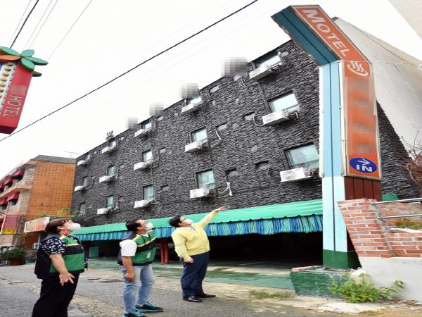 염태영 시장이 점검한 세류2동 숙박업소의 대형 입간판은 바람으로 인해 옆 건물 담장 쪽으로 조금 기울었다. 염태영 시장은 “시민 안전에 위협이 되지 않도록 신속하게 조치하라”고 지시했다.