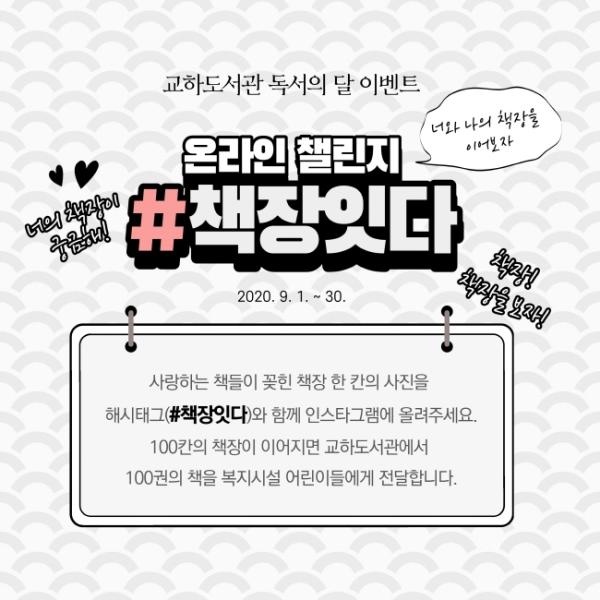 독서의 달 온라인 챌린지 ‘책장 잇다’는 9월 1일부터 30일까지 한 달간 인스타그램을 통해 누구나 참여 가능하며 자세한 사항은 교하도서관 홈페이지나 전화(☎031-940-5185)로 문의하면 된다.