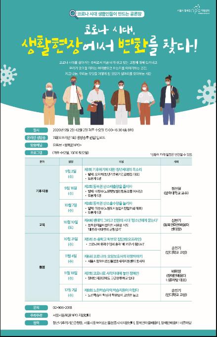 [KNT한국뉴스타임] 서울시동북권NPO지원센터는 9월 2일부터 “코로나 시대, 생활현장에서 변화를 찾다.”라는 주제로 7회에 걸쳐 온라인 공론장을 운영한다.