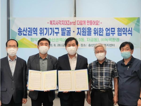 [KNT한국뉴스타임] 의정부시 송산3동(권역동 국장 윤무현)은 8월 28일 관내 청소대행 업체인 ㈜녹색환경(대표 김성일)과 ‘송산권역 위기가구 발굴·지원을 위한 업무협약’을 체결하였다.
