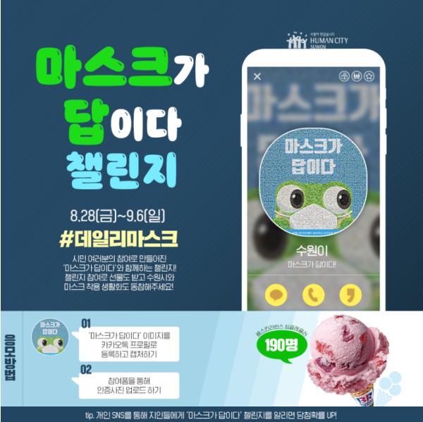 수원시 대표 SNS에서 ‘‘마스크가 답이다’ 챌린지에 동참해 주세요’ 게시물을 찾아 첨부된 이미지를 자신의 카카오톡 프로필 사진으로 올리고, 네이버 폼(http://naver.me/xT76iyds)으로 인증사진을 보내면 된다. 추첨을 통해 참여 시민 190명에게 ‘아이스크림 쿠폰’을 지급한다.