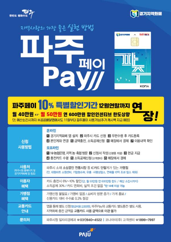 [KNT한국뉴스타임] 파주시는 9월부터 12월까지 지역화폐 10%특별할인기간에 할인인센티브 지급 한도를 기존 월40만원 연400만원에서 월50만원 연600만원으로 한도를 상향 발행하기로 했다.