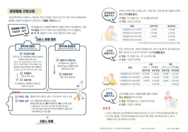 아이돌봄 지원사업은 아이돌보미가 전문적인 1:1 돌봄서비스를 제공하는 제도로 임시보육, 놀이 활동, 아동식사 제공 및 등·하원 보조 등 다양한 서비스를 제공하게 된다.