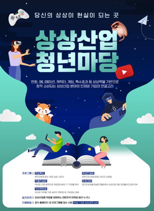 서울시가 미래 유망산업인 문화콘텐츠 분야 글로벌 인재를 양성하기 위한 특화된 취업프로그램인 ‘상상산업청년마당’을 본격 운영한다고 밝혔다. 컴퓨터그래픽(CG) 분야를 시작으로, 웹툰, 캐릭터, 게임 등 다양한 분야에 대한 취업컨설팅을 무료로 제공한다.