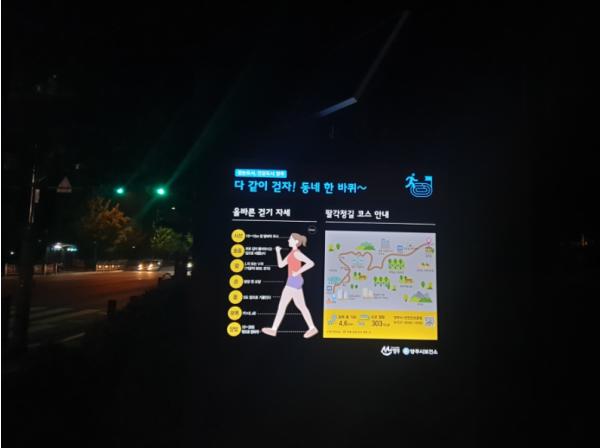 양주시(시장 이성호)는 코로나19 사회적 거리두기 조치 강화로 인한 외부활동의 제약으로 신체활동이 줄어든 시민들의 건강증진을 위해 ‘우리동네 걷기 길’에 LED 건강걷기 안내판을 설치했다고 밝혔다.