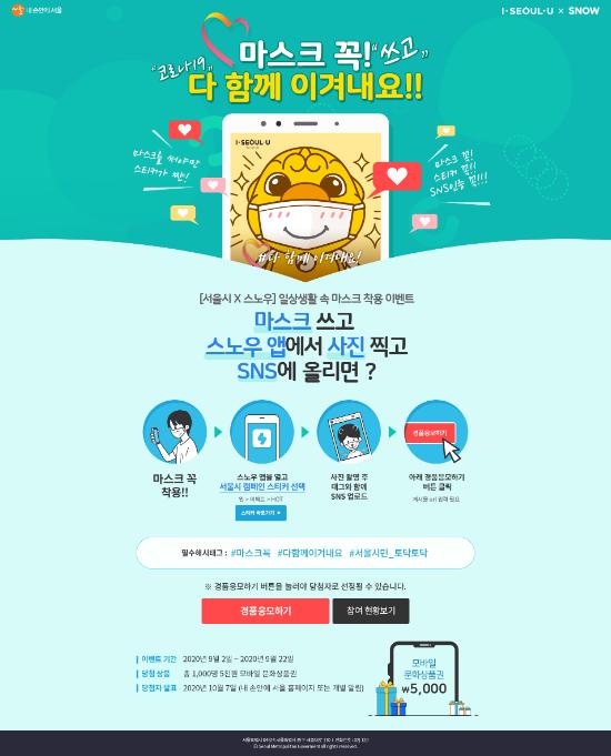 이번 캠페인은 인기 카메라 앱인 ‘스노우(SNOW)’와 함께 오는 9월 2일부터 22일까지 진행한다. 스노우 앱에서 마스크 착용을 독려하는 특별 스티커 3종을 제공하며, 이를 활용해 시민 누구나 캠페인에 참여할 수 있다.