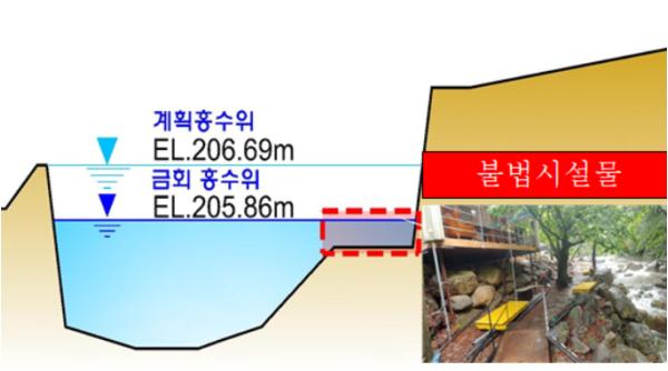 하천?계곡 내 평상·컨테이너 등의 불법 시설물은 집중호우 시 물의 흐름을 방해, 수위를 상승시켜 홍수설계빈도 이하의 강우에도 쉽게 하천의 범람을 유발하는 주요 원인이 된다.