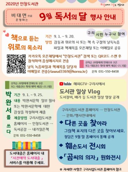 구리시(시장 안승남)인창도서관은 9월 독서의 달을 맞아 시민들이 책을 매개로 가족과 함께 즐기며 코로나 우울증을 치유할 수 있는 다양한 독서 진흥 프로그램을 운영한다.