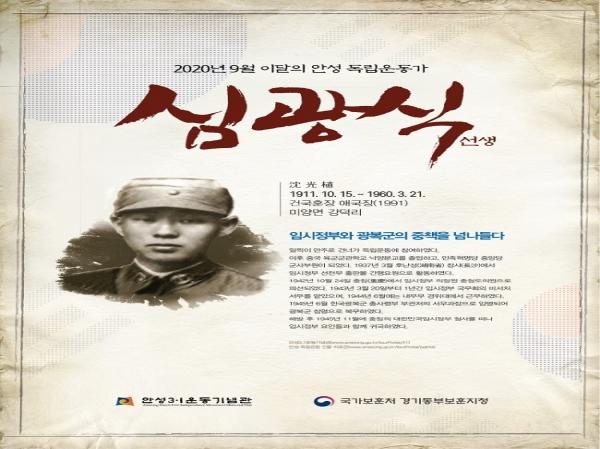 [KNT한국뉴스타임] 안성시와 경기동부보훈지청이 공동으로 2020년 9월 이달의 안성 독립운동가로 심광식(沈光植, 1911~1960) 선생을 선정했다.