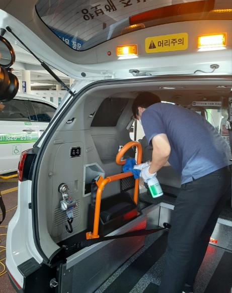 이동지원센터에서는 직원 모두 출·퇴근시 발열체크 후 마스크착용 근무를 하고 있으며 행복콜 차량의 소독을 운행 전 후 일 2회 이상 하고 있다.