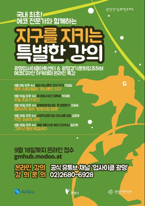 참여를 원하는 시민은 18일까지 ‘지구를 지키는 특별한 강의’사이트(http://gmhub.modoo.at/ )에서 온라인으로 신청하면 된다. 강의 영상은 광명업사이클아트센터 공식 유튜브 채널 ‘업사이클광명’에서 실시간 라이브 방송으로 진행된다.
