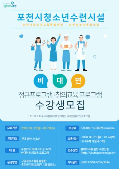 [KNT한국뉴스타임=포천] 포천시 청소년수련시설(포천시청소년교육문화센터 및 포천청소년문화의집)은 포스트코로나 시대를 대비해 관내 청소년들을 대상으로 비대면 창의교육·정규프로그램을 운영한다.