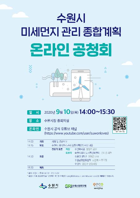 [KNT한국뉴스타임] ‘수원시 미세먼지 관리 종합계획(2021~2025년)’을 수립하기 위한 온라인 공청회가 오는 10일 오후 2시 유튜브 채널을 통해 생중계된다.