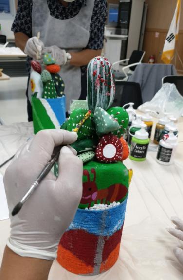 업싸이클은 버리면 쓰레기, 다시 쓰면 자원이 되는 환경을 생각하는 프로그램으로 캔, 종이, 양말목, 돌 등을 활용하여 새로운 제품과 작품을 만드는 중리동만의 특색있는 강좌다.