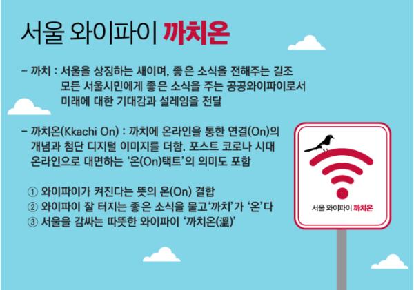 서울시는 공공와이파이 브랜드도 ‘까치온(Kkachi On)’으로 확정해 발표한다. 시는 9일(수) 14시 20분 서울시청 간담회장에서 ?서울시 공공와이파이 브랜드 및 브랜드 이미지(BI) 발표식?을 갖고, ‘까치온’의 브랜드 이미지(BI)를 처음으로 공개한다.