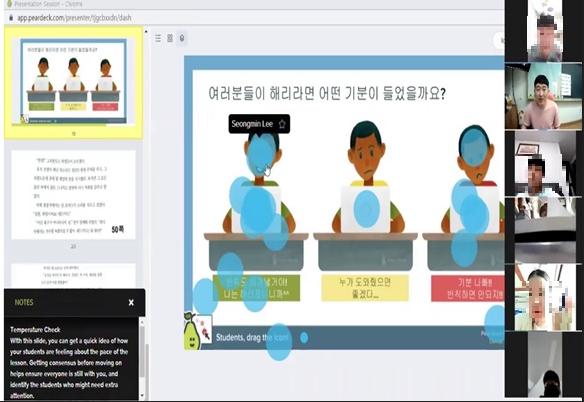 이번 수업 나눔에서 3학년 국어 교육과정을 재구성하여 수업을 진행한 박한솔 교사는 “쌍방향 수업은 원격수업의 여러 가지 수단 중 하나이지 목적이 아닙니다. 저희의 목적은 ‘아이들을 잘 가르치는 것’이고 이를 위한 방법 중의 하나로 쌍방향 수업을 선택했습니다. 쌍방향 수업의 가장 큰 장점은 학생들과의 실시간 소통 및 피드백이 가능하다는 것이고 지금의 상황에서 최대한 등교수업과 가깝게 운영할 수 있는 방법이라고 생각합니다.”고 말했다.
