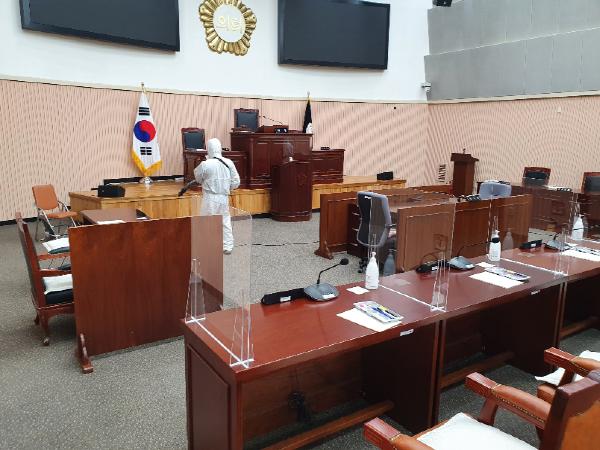 본회의장에는 참석자 간 거리두기를 위하여 발언대와 의원석에는 비말차단가림막을 설치하고 마이크에도 일회용 덮개를 씌웠다. 또한 구석구석 살균 소독을 완료하는 등 임시회 개회를 위한 사전 예방조치 준비를 마쳤다.
