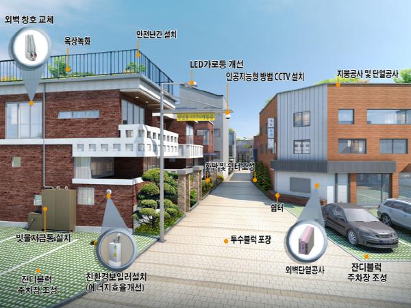예컨대, 외벽과 창호는 단열 성능이 좋은 제품으로 설치해 난방비 절감효과를 거둘 수 있고, 골목길 바닥은 투수블럭으로 포장하며 LED 가로등과 인공지능형 방범CCTV도 설치할 수 있다.