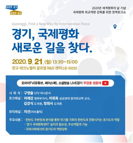 [KNT한국뉴스타임] 9.21 세계평화의 날을 기념해 경기도의 국제평화 외교역량 강화 방안을 모색해보는 정책토크쇼가 오는 21일 오후 1시 30분부터 판교 테크노밸리 글로벌 R&D센터에서 개최된다.