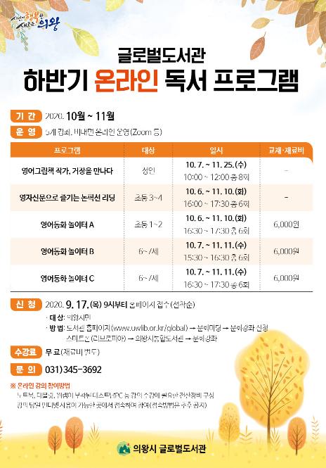 [KNT한국뉴스타임] 의왕시 글로벌도서관은 코로나19로 현장교육 참여가 어려운 시민들을 위해 영어독서와 관련한 배움의 기회를 제공하고자 가정에서 온라인으로 참여할 수 있는 영어독서강좌를 오는 10월 6일부터 운영한다고 밝혔다.