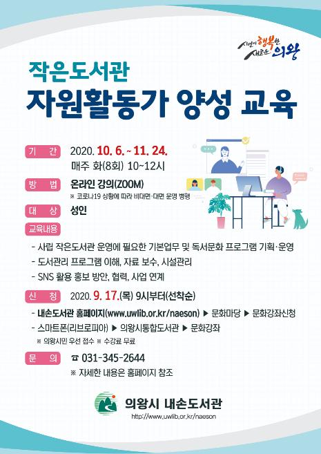 [KNT한국뉴스타임] 의왕시 내손도서관은 오는 17일부터‘작은도서관 자원활동가 양성 교육’강좌 신청을 받는다.