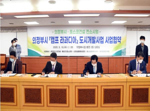 의정부시(시장 안병용)는 9월 16일 의정부시 캠프 라과디아 도시개발사업 공모를 통해 우선협상대상자로 선정된 포스코건설 컨소시엄[㈜포스코건설, 메리츠증권㈜, 하나금융투자㈜, 신한금융투자㈜, ㈜유앤미개발과 성공적인 사업시행을 다짐하고, 지역의 균형발전을 골자로 하는 사업협약을 체결했다.
