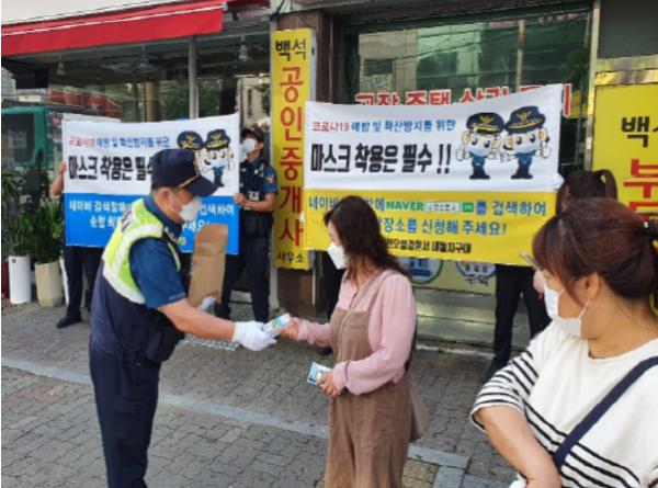[KNT한국뉴스타임] 경기도 부천시 오정경찰서 내동지구대(지구대장 김대호)는 수도권의 코로나19 강화조치로 그동안 국정과제로 선정 운영한 순찰신문고 탄력순찰 신청이 전년도와 비교할 때 현저하게 감소 된 것으로 확인됨에 따라서, 코로나19 예방 및 확산방지를 위한 마스크 착용 홍보와 병행하여‘장소 이동 게릴라식 안심순찰 홍보 캠페인’을 벌이고 있다고 밝혔다.