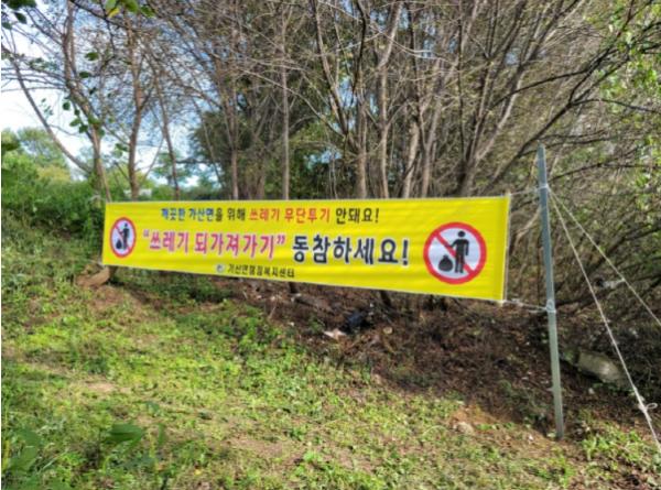가산면은 성묘객이 편리하게 산소를 찾을 수 있도록 관내 공설묘지 진입로 등 우거진 잡목과 잡초를 제거하는 한편, 쓰레기 무단투기 예방을 위해 공설묘지 입구에 ‘쓰레기 되가져가기’ 동참 현수막을 게시해 홍보하고 있다.