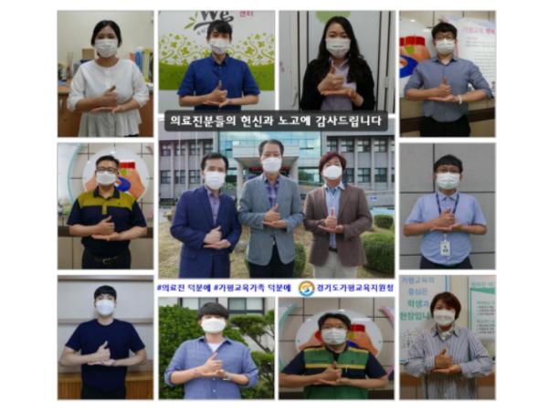 [KNT한국뉴스타임] 경기도 가평교육지원청(교육장 김화형)이 코로나19 확산 방지를 위한 최전선에 있는 의료진과 안전한 교육환경을 조성하기 위해 노력하고 있는 가평 교육가족에게 존경과 감사의 마음을 전하기 위해 ‘덕분에 챌린지’에 동참했다고 밝혔다.
