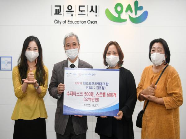 오산시(시장 곽상욱)는 17일 오산시 예비마을기업 핸즈프렌즈 협동조합(이사장 김유정)에서 관내 취약계층 장애인들을 위해 조합원들이 한땀 한땀 직접 제작한 수제마스크와 스트랩 500개를 기탁했다고 밝혔다.
