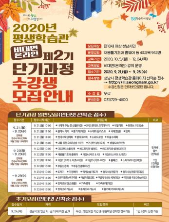 [KNT한국뉴스타임] 성남시는 오는 9월 21일부터 23일까지 평생학습 ‘배움과 채움’ 제2기 단기과정 수강생 942명을 모집한다.