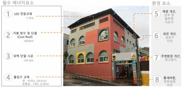 대상시설은 사용승인 후 15년 이상 된 국공립어린이집 11개소와 보건진료소 1개소이며, 고성능창호, 폐열회수형 환기장치, 내?외벽단열, 고효율 냉난방장치, 고효율 보일러, 고효율 조명(LED), 신재생에너지, 건물에너지관리시스템(BEMS)의 교체 및 설치로 어린이집 원아들과 진료를 위해 보건소를 찾는 방문객들에게 쾌적한 환경을 제공하게 된다.